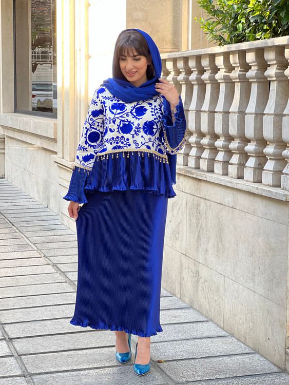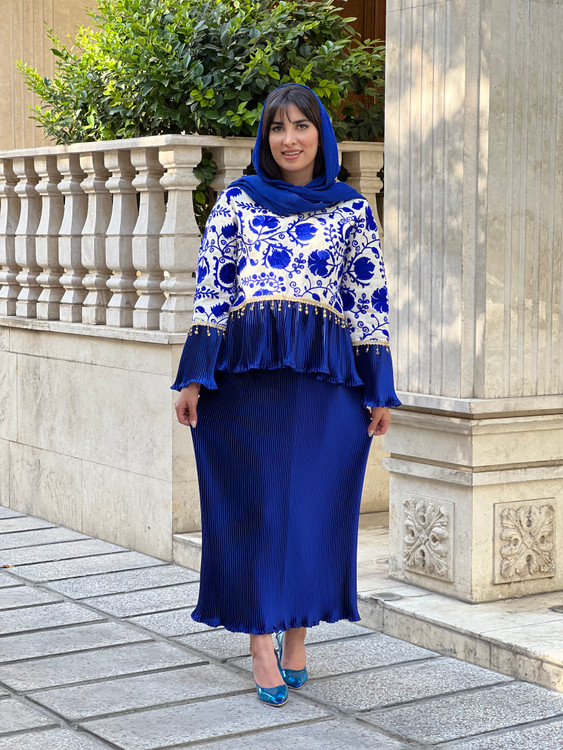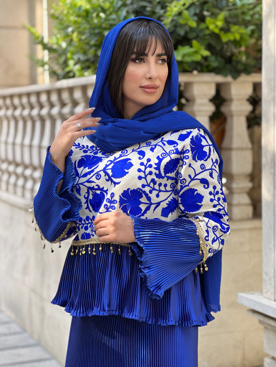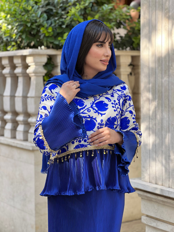 جنس کت سوزندوزی هندی میباشد و داخل کار کامل لایی کوبی شده و پشت کار دکمه دارد جنس دامن اتن پلیسه الیکس میباشد و برای شستشو به خشک شویی داده شود